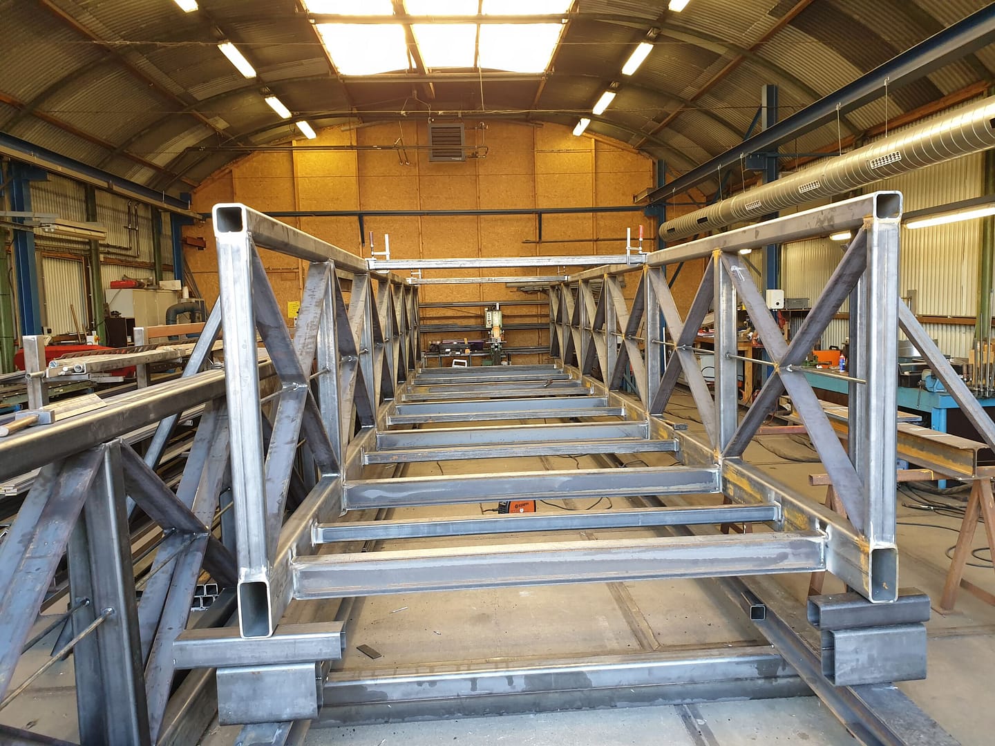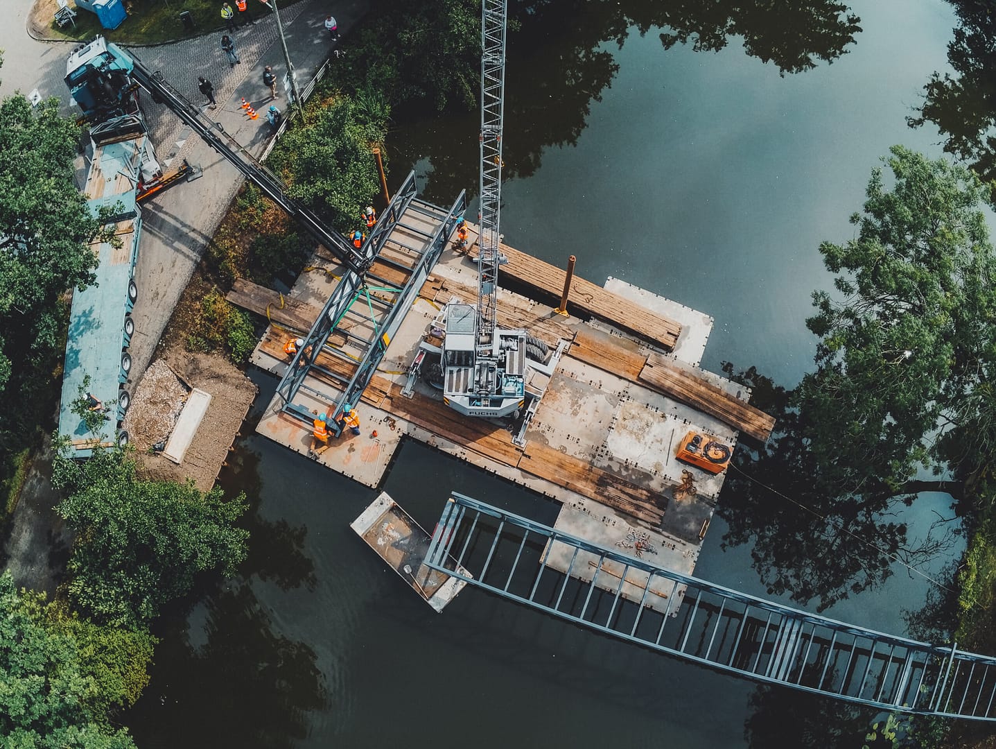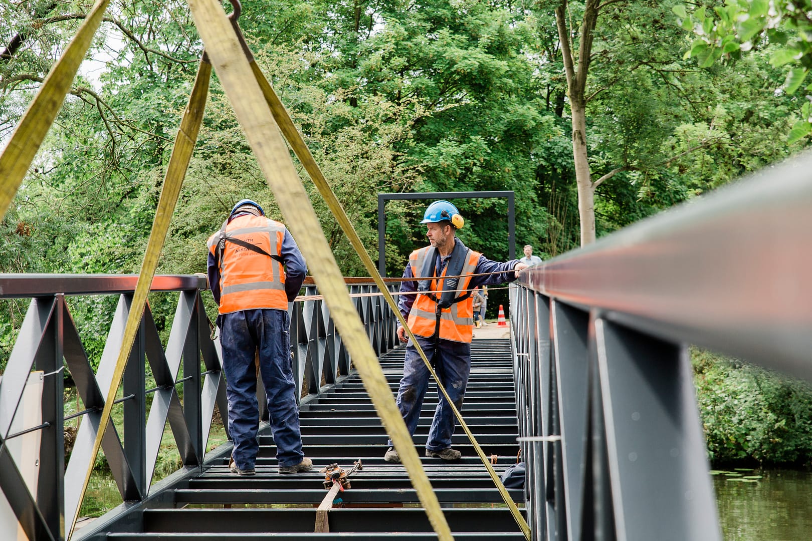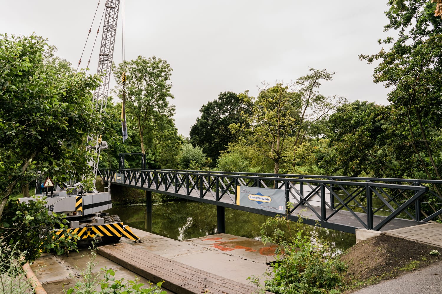 De stalen voetgangersbrug is in onze eigen staalwerkplaats samengesteld en gelast. Door de ervaring van onze vakmensen en extra aandacht voor de maatvoering hebben wij er voor gezorgd dat de brugdelen op de millimeter nauwkeurig geplaatst konden worden. Binnen een halve dag lagen alle drie de brugdelen perfect op hun plek. Het is oprecht een stukje vakwerk geworden.